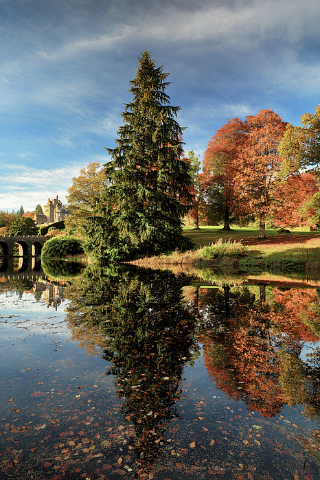 Trees reflecting on a pond from Drummond Castle Gardens with the colour of autumn in full bloom.Crieff, Scotland.