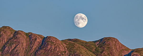 A large, bright moon hovers in a clear blue sky above a rugged mountain range of Ben Hiant. The soft light highlights the mountain peaks, creating a... more