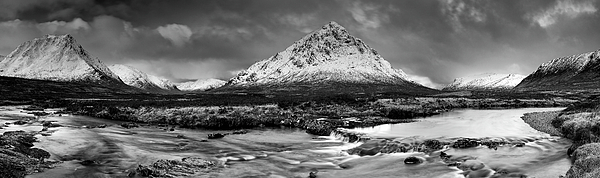 A black and white shot of The Buachaille Etive Mor (Great Herdsman of Etive) and River Etive mountain panorama, sprinkled with a dusting of snow on a... more