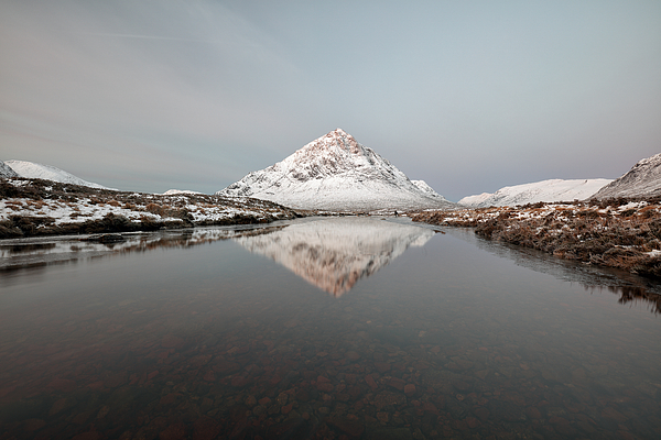 The snow covered Buachaille Etive Mor mountain reflecting on River Etive during Sunrise.