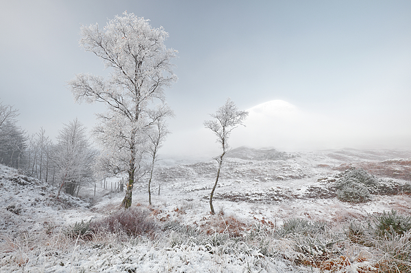 Frost covered trees on a snow and mist covered Scottish highland winter landscape.