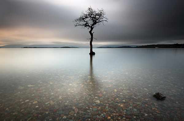 A lone tree partially submerged in the water of Loch Lomond, Scotland.