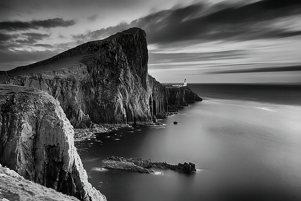 A black and white long exposure taken at Neist point on the Isle of Skye.