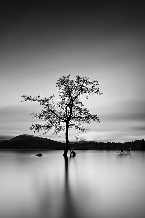 A long exposure of a lone tree partially submerged in the water of Loch Lomond, Scotland.